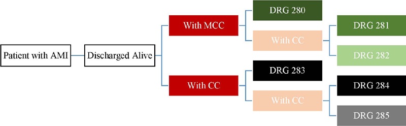 DRGs 280 and 283 are composed of patients who have MCC. DRGs 281 and 284 have only patients who have CC. Finally, DRGs 282 and 285 are composed of patients who do not have MCC or CC.