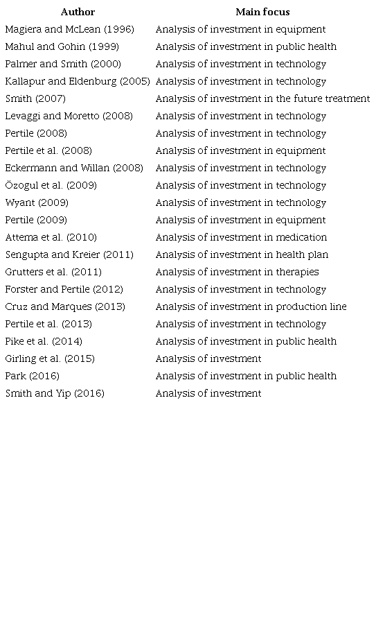 Although the studies related to the Real Option Theory - ROT began with Myers (1977), it was only in 1996 that journals reported the application of ROT in the health sector. The application of the ROT in the health sector started when Magiera and McLean (1996) demonstrated how the Real Option Analyses - ROA can effectively support the decision to invest in either a stationary or mobile lithotripter.
