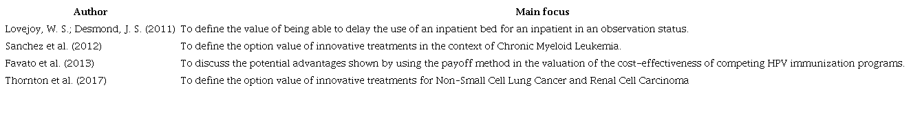 In summary, the studies presented in Table 2 focused on: a) measuring the value of the option of treatment, b) analyzing the delay in the consumption of hospital resources. It should be noted that, in healthcare, the cost-effectiveness analysis is used to decide which treatment should be adopted. However, these papers showed that the value of the option could be used to decide whether the new treatment should be considered.