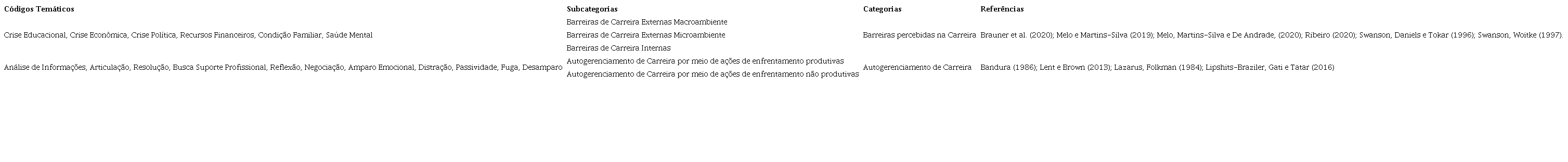 Nesta etapa, constatou-se 17 códigos temáticos, sendo exemplos: crise econômica, recursos financeiros, saúde mental, distração e fuga. A terceira e última fase, tratamento dos resultados, foi conduzido o processo de estabelecer os vínculos conceituais existentes entre os códigos temáticos. Feito isso, obteve-se a formação de 2 categorias temáticas (Barreiras percebidas na Carreira e Autogerenciamento de Carreira), e cada categoria incluiu suas subcategorias. O Quadro 1 apresenta, enfim, os códigos temáticos, as subcategorias e categorias que emergiram dos dados analisados.