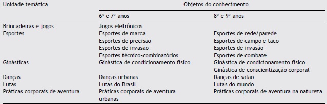 Na BNCC, as unidades temáticas de Brincadeiras e jogos, Danças e Lutas estão organizadas em objetos de conhecimento conforme a ocorrência social dessas práticas corporais, das esferas sociais mais familiares (localidade e região) às menos familiares (esferas nacional e mundial). Em Ginásticas, a organização dos objetos de conhecimento se dá com base na diversidade dessas práticas e nas suas características. Em Esportes, a abordagem recai sobre a sua tipologia (modelo de classificação), enquanto Práticas corporais de aventura se estrutura nas vertentes urbana e na natureza (Brasil, 2017, p. 227).