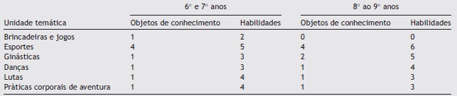 O desequilíbrio na distribuição dos objetos de conhecimento e, principalmente, das habilidades pode induzir o professor a dedicar tempos pedagógicos distintos para cada unidade temática. Surpreendentemente, o esporte figura hegemônico num documento que suscitaria a justiça curricular caso o ordenamento fosse paritário (tabela 3).