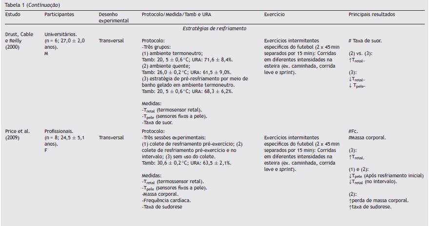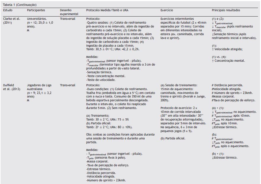 Em um estudo classificado como excelente (tabela 2), foram encontradas uma maior temperatura central (39,6 ± 0,1 vs. 38,7 ± 0,1 °C), uma redução de 7% da distância total percorrida e uma menor distância total percorrida em corridas de alta intensidade (43 °C: 883 ± 45 m vs. 21 °C: 978 ± 97 m) em jogadores de elite durante o jogo em ambiente quente (43 °C), quando comparado com o ambiente temperado (21 °C) (Mohr et al., 2012). Um trabalho classificado como moderado (tabela 2) usou uma sessão de treinamento no frio (5,1 °C) para avaliar o balanço de fluídos e eletrólitos em jogadores de elite (Maughan et al., 2005). Embora esse trabalho tenha encontrado um resultado interessante de que a perda de suor pode ser substancial no frio, algumas considerações metodológicas levam à cautela na interpretação desses resultados. Destaca-se o fato de que não houve padronização das vestimentas durante o treinamento. Sabe-se que a área de superfície exposta estará diretamente associada à perda úmida de calor durante o exercício (Nakamura et al., 2008), isso pode ter gerado diferentes níveis de perda de massa corporal durante o treinamento.