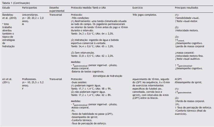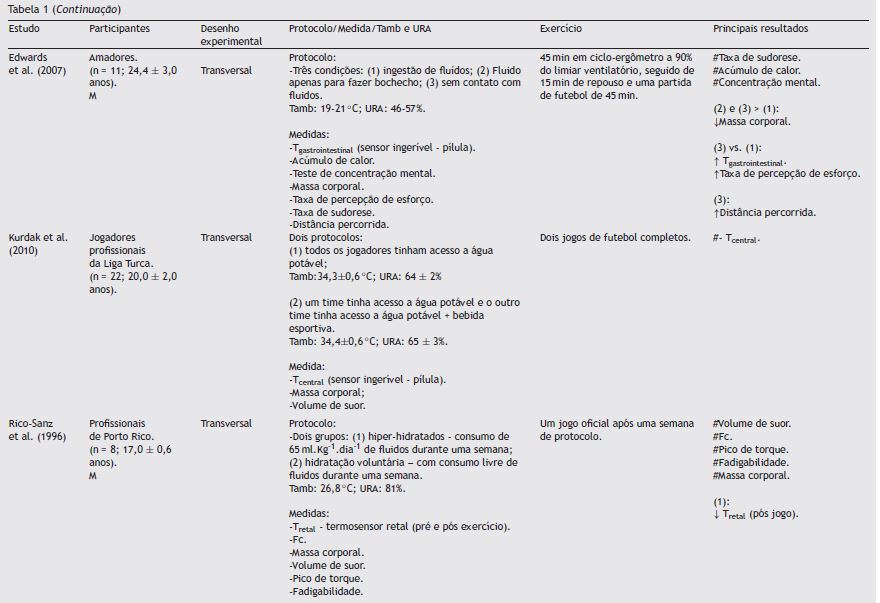 Um trabalho avaliou os efeitos da hidratação e das respostas de sudorese em dois jogos em ambiente quente (∼34 °C) (Kurdak et al., 2010). Foi usada uma estratégia de ingestão de água em um jogo e de bebida esportiva hidroeletrolítica comercial. Não houve diferenças nas respostas da temperatura gastrointestinal ao longo dos jogos. Um estudo encontrado avaliou os efeitos de diferentes estados prévios de hidratação sobre o desempenho de jogadores de futebol profissionais jovens durante um jogo oficial (23,0 °C) (Rico-Sanz et al., 1996). Os autores aplicaram um protocolo de hiper-hidratação (H: ingestão de 65 mL.Kg-1.dia-1 de água durante uma semana), enquanto o grupo controle (CON) teve livre consumo de líquidos durante o período. Foi observada uma menor perda de massa corporal (H: 1,77 ± 0,24 kg vs. CON: 1,89 ± 0,27 kg; p < 0,05) e menores aumentos da temperatura central (ΔH: 1,71 ± 0,17 vs. ΔCON: 2,04 ± 0,31 °C) no grupo H durante o jogo. Ali et al. (2011) estudaram a influência da ingestão de fluídos sobre as respostas termorregulatórias de jogadoras de futebol em uma partida simulada (90 min). Os autores encontraram que a reposição de fluídos preveniu a desidratação, bem como atenuou o aumento da temperatura central e o estresse cardiovascular. Um dado importante desse trabalho foi a maior percepção do esforço observada no grupo que não ingeriu água. Além disso, a reposição de fluídos não foi capaz de contrapor a redução do desempenho na realização de sprints e nenhuma diferença foi observada no teste de habilidade na prática de passes.