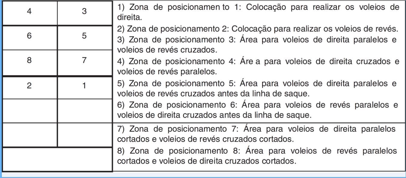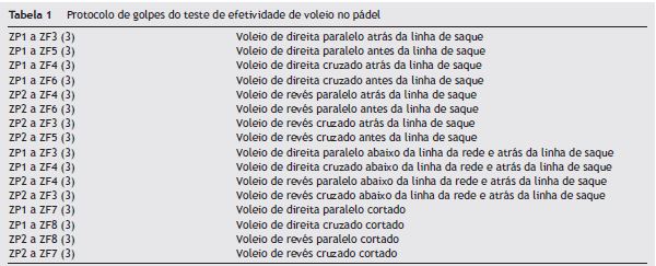 Para avaliar a precisão de voleio, foi feito teste específico de pádel que consiste na aplicação de 48 voleios divididos em áreas determinadas da quadra (Montes Fernández; Rojo Rodriguez, 2015). São demarcadas oito áreas dentro da quadra, divididas em zonas de posicionamento e zonas de finalização, de acordo com a figura 1 (Montes Fernández; Rojo Rodriguez, 2015). Um monitor previamente treinado, e cegado quanto aos objetivos do estudo, foi posicionado de modo centralizado ao fundo da quadra, de onde lançou as bolas em 16 grupos de três voleios em ordem pré-determinada conforme a tabela 1. Registrou-se o número de voleios acertados pelo sujeito e foi mensurada a frequência relativa (porcentagem) de acertos e erros.