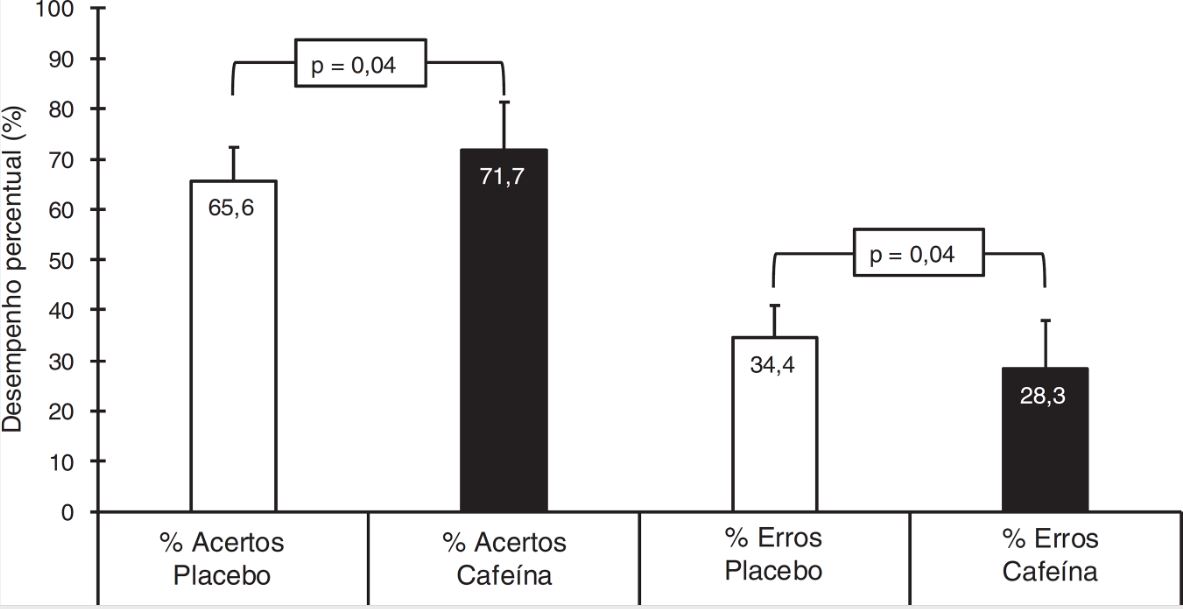 Os efeitos da suplementação de cafeína em esportes de raquete (tênis, badminton e squash) foram investigados sobre os movimentos na quadra durante um teste específico de agilidade em um experimento randomizado duplo-cego com 6mg•kg–1 de cafeína ou placebo (Nicholson et al., 2013) e foram observadas melhorias nas duas tentativas (T1 e T2) com a ingestão de CAF 60 minutos antes do procedimento (45,63 ± 3,66 vs. com CAF e 47,57 ± 3,67 vs. com PLA em T1 e 44,91 ± 4,78 vs. com CAF e 46,70 ± 4,64 s com PLA em T2) (Nicholson et al., 2013). Além disso, aumento na glicose no sangue foi identificado após o consumo de CAF (CAF: 4,69 ± 0,30 mmol.l–1; PL: 4,00 ± 0,25 mmol.l–1), o que poderia ter adiado a fadiga no sistema de energia glicolítica e melhorado o desempenho esportivo (Nicholson et al., 2013). Esses achados complementam o presente estudo, que investigou a precisão de golpes no pádel, concluiu-se que além de obter mais acertos em teste de precisão, o posicionamento e a movimentação na quadra podem ser mais eficientes após a ingestão de cafeína em jogadores dessa modalidade.