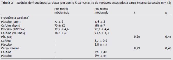 Quanto aos efeitos da suplementação com cafeína na FC (tabela 2), não foram observadas diferenças entre condições (F[1,11] = 0,01; p = 0,91), mas entre momentos (F[1,11] = 1.279,4; p < 0,001), sem interações significantes (F[1,11] = 1,9; p = 0,19). O mesmo comportamento foi observado com a PSE (p = 0,41) e com a carga interna, produto da multiplicação da PSE pela duração da sessão (p = 0,40). Também não foram localizadas diferenças no delta da frequência cardíaca, a condição PLA elevou 101 ± 13 bpm e CAF aumentou 106 ± 10 bpm.