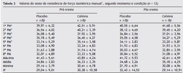 Na análise do teste de oito preensões manuais sucessivas, não foram observadas diferenças entre momentos (pré versus pós; F[3,44] = 0,38; p = 0,54; e2p = 0,01) e entre condições (placebo versus cafeína; F[3,44[= 0,85; p = 0,36; e2p = 0,02); bem como interações (condição versus momento; F[3,44] = 0,21; p = 0,65; e2p = 0,005). Ademais, indica-se que houve tendência linear de queda ao longo das tentativas (F(3,44) = 133,1; p < 0,001; e2p = 0,75), independentemente do momento ou da condição de avaliação (tabela 3). Não foram observadas diferenças significantes nos valores máximos (condições: F[3,44] = 4,71; p = 0,27; e2p = 0,83; momentos: F[3,44] = 0,39; p = 0,64; e2p = 0,28), médios (condições: F[3,44] = 4,07; p = 0,29; e2p = 0,80; momentos: F[3,44] = 1,45; p = 0,41; e2p = 0,64) e no índice de fadiga (condições: F[3,44] = 0,17; p = 0,74; e2p = 0,15; momentos: F[3,44] = 0,21; p = 0,73; e2p = 0,17).