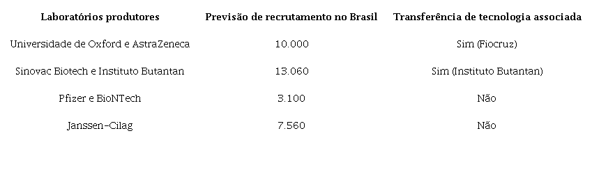 Além de oportunidades científicas e políticas, os testes clínicos no Brasil têm sido traduzidos em limitadas estratégias de barganha por uma posição mais favorável na “fila” pelas primeiras doses de vacinas. Dentre as quatro candidatas atualmente testadas no país, duas contam com acordos entre governos federal e do estado de São Paulo e os laboratórios fabricantes para acesso aos produtos dos estudos.10 Para a vacina produzida pela Sinovac, o governo de São Paulo estabeleceu um acordo de transferência de tecnologia, que permitirá ao Instituto Butantan produzir doses de vacinas a serem publicamente distribuídas. De modo semelhante, o governo federal negociou um acordo com a AstraZeneca que permitirá a formulação, o envase e o controle de qualidade de produção da “vacina de Oxford” pela Fundação Oswaldo Cruz. As expectativas das autoridades brasileiras eram de que, uma vez demonstradas eficácia e segurança satisfatórias para tais produtos, o país tivesse autonomia imediata para produzir doses de vacinas para distribuição e imunização nacionais.