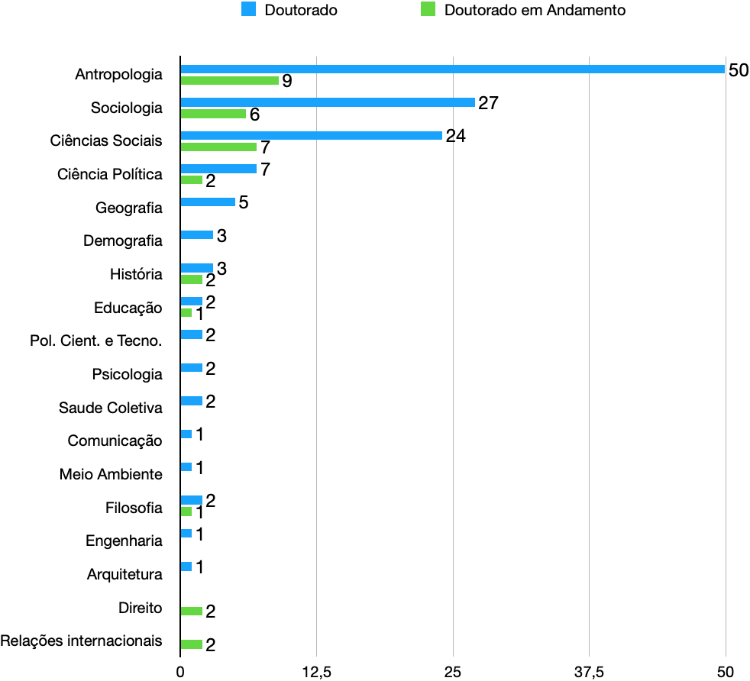 We observe that the greatest number of authors hold doctorates in Anthropology (fifty with completed degrees and 9 currently working on their PhDs). Sociology appears in second place (27 PhDs and 6 PhD candidates) followed by those who have post-graduate degrees in Social Sciences (24 PhDs and 6 PhD candidates). This is followed by Political Science, with a significantly lesser presence (7 PhDs and 2 PhD candidates) as well as a large number of authors from other areas, with 5 or less PhDs and PhD candidates: Geography, Population Studies, History, Education, Scientific and Technological Policy, Psychology, Public Health, Communications, Environmental Studies, Philosophy, Engineering, Architecture, Law and International Relations.