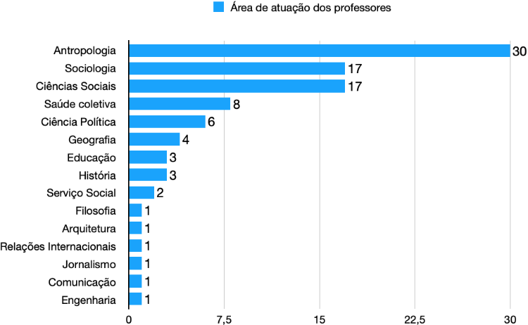 Regarding the areas of activity of researchers with teaching careers, most of them work in one of the three major areas of Social Sciences, in postgraduate programs in Anthropology (30), Sociology (17), Social Sciences (17), Political Science (6) and International Relations (1). The presence of social scientists working at the interface with the areas of Public Health is also significant (8). There is also an expressive presence of authors who work in the major areas of Humanities - Geography (4), Education (3), History (3), Philosophy (1) - and in the Applied Social Sciences: Social Work (2), Architecture (1), Journalism (1), Communication (1) and Engineering (1). The graph below shows the diversity of areas of activity of Bulletin authors, also providing information on how the different social sciences act together and in conjunction with other major areas of knowledge.