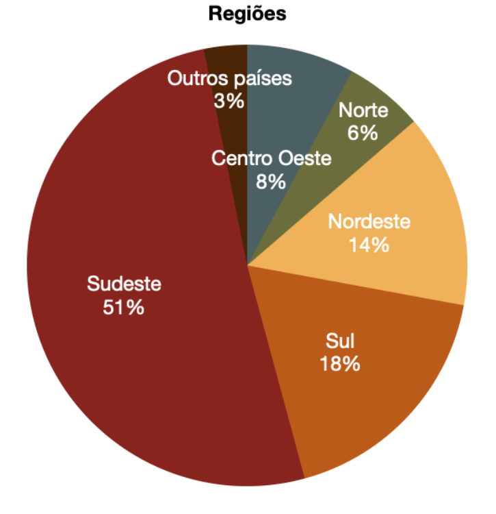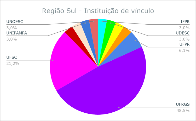 A surprise, in terms of the South, is the expressive presence of the UFRGS (48.5%) (Rio Grande do Sul), followed by the UFSC (21.2%) (Santa Catarina) and UFPR (6.1%) (Paraná). Other participating institutions are the UDESC e UNOESC (Santa Catarina), UNIPAMPA (Rio Grande do Sul) and IFPR (Paraná) (3% each).
