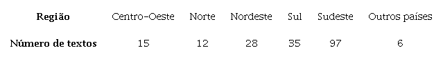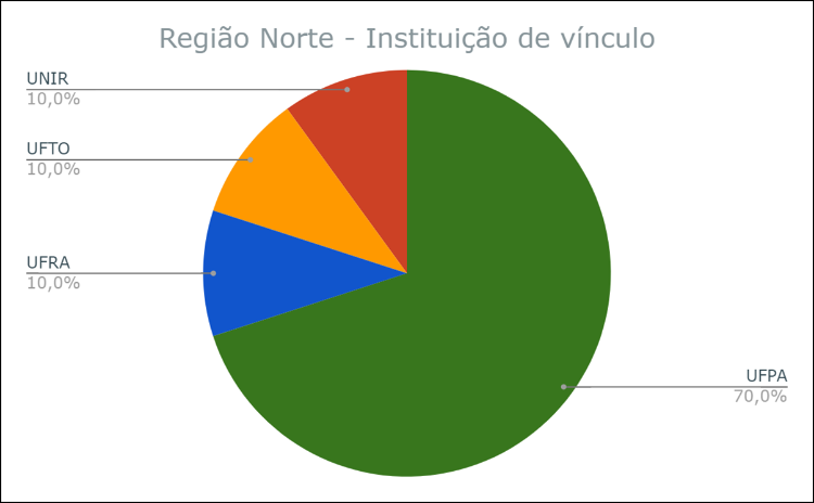 In the North, with 11 texts originating in institutions from that region, the most expressive institution is the UFPA (state of Pará), responsible for 70% of all the publications of the region, followed by the UNIR (Rondônia) and UFTO (Tocantins).