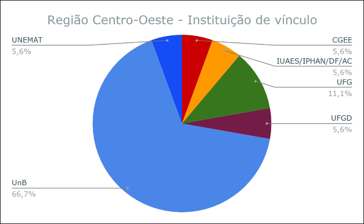 In the Central West, the UnB (Brasília) stands out as the university with the largest number of contributions (66.7%), followed by UFG (Goiás) with 11.1%, UFGD (Mato Grosso do Sul) and UNEMAT (Mato Grosso), with one published article each (5.6%). Also noteworthy is the collaboration of authors linked to non-university institutions such as CGEE and IPHAN (institutions based in Brasilia).