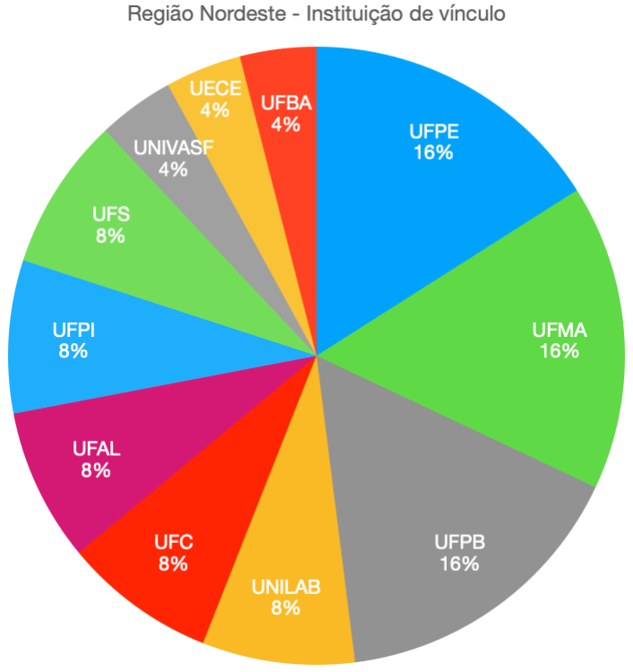The Northeast region may be noted for its wide variety of participating universities, boasting the presence of social scientists working in universities in all of the states of the region, and diverse in their own right: UFPE (Pernambuco), UFMA (Maranhão), UFPB (Paraíba) with the most texts (16% each), followed by UNILAB (Bahia and Ceará), UFC (Ceará), UFAL (Alagoas), UFPI (Piauí) and UFS (Sergipe) with 8% each and UNIVASF (Pernambuco), UECE (Ceará) and UFBA (Bahia) at 4%.