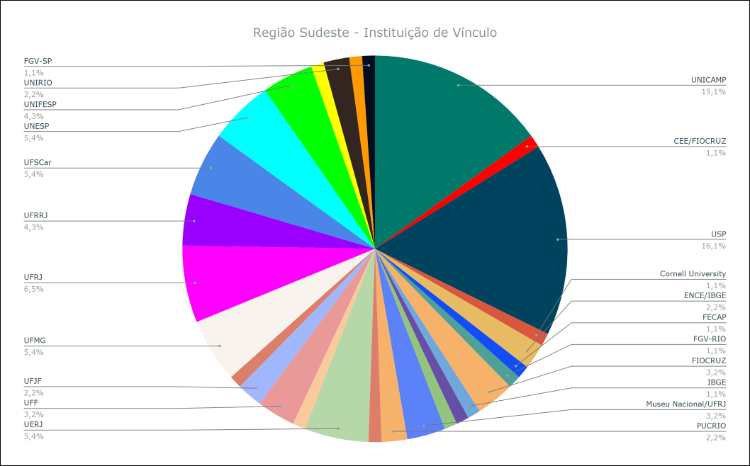 The Southeast is the most diversified region, with 22 institutions producing material for the Bulletin: USP (16.1%) e UNICAMP (15.1%), institutions located in the state of São Paulo, contribute the largest number of texts, followed by the UFRJ (6.5%), Rio de Janeiro, UFMG (5.4%) - Minas Gerais UFSCAR (5.4%) UNESP (5.4%) and UNIFESP (4.6%) both from the state of São Paulo and finally two other institutions from the state of Rio de Janeiro, UERJ (5.4%) e UFRRJ (4.3%).