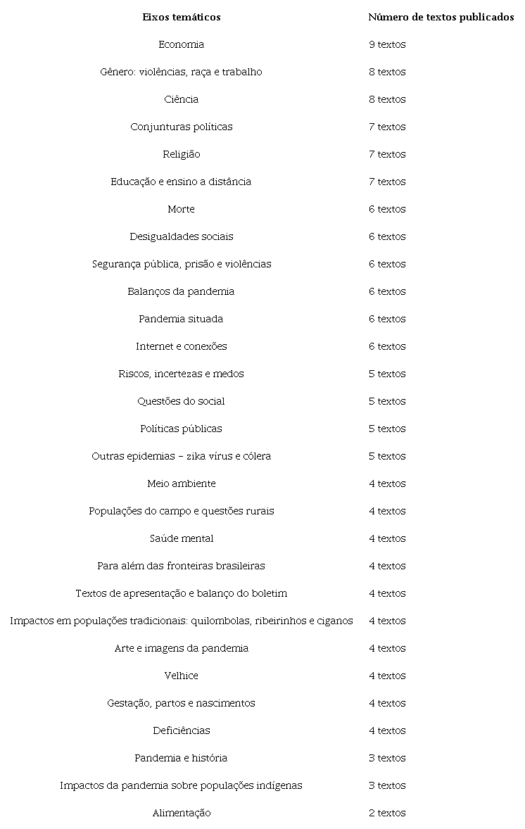 These themes offer us a principle for the organization and comprehension of the structures of argument through which the social sciences responded to the pandemic in Brazil, in its early months. In addition to the five categories indicated above, we now turn to examine the themes that were covered in the Bulletin. We introduce and discuss some of the defining characteristics that the Bulletin acquired, using data that help us to situate the initiative and, through it, the more general characteristics of Brazilian social sciences.