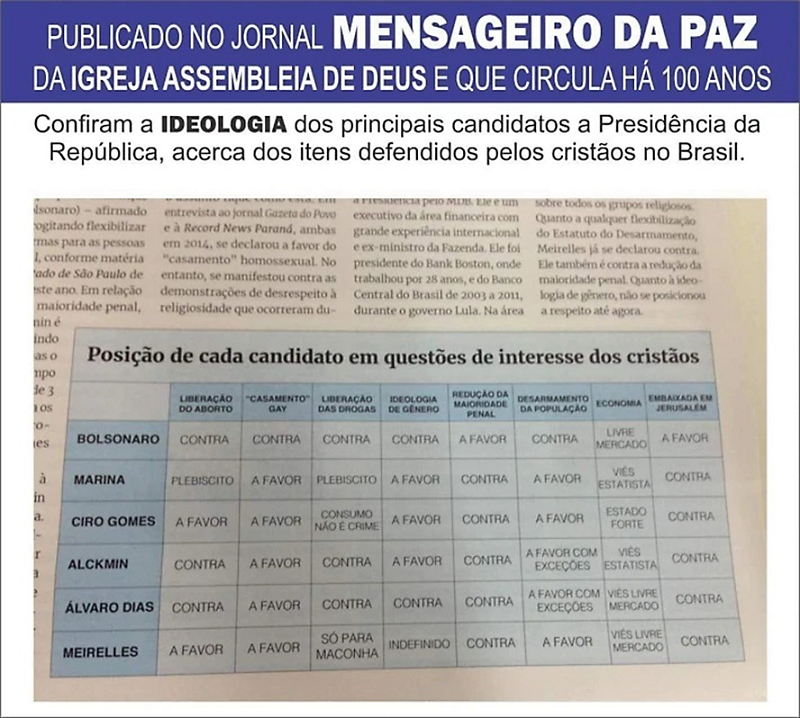 In their context, it is part of the daily battle of a UCKG Christian to choose the side of the good and spread the word, and this includes political action. And this was no different in the 2018 elections, or in any elections. A good example of the importance of these issues in evangelical political thinking in 2018 does not come from the UCKG, but from the Assembly of God’s newspaper, Mensageiro da Paz. The newspaper published an infographic during the presidential campaign with the title “Each candidate’s position on subjects of importance to Christians”. This spreadsheet presented the following columns: “abortion legalization”, “gay marriage”, “drug legalization”, “gender ideology”, “reduced age of criminal responsibility”, “population disarmament”, “economy”, and “embassy in Jerusalem”. Jair Bolsonaro was listed as being ‘against’ in the columns “abortion legalization”, “gay marriage”, “drug legalization”, “gender ideology”, and “population disarmament”; and ‘in favor’ of the “reduced age of criminal responsibility” and “embassy in Jerusalem”. In the “economy” column, the definition listed was “free market”. Among the candidates listed, he was the only one positioned as against “gay marriage” and “disarmament of the population”. He shared only with Álvaro Dias the position against “gender ideology” was also the only one in favor of the “embassy in Jerusalem”. The topics chosen as “important for Christians” and the position attributed to Bolsonaro in them are of great importance for understanding the contemporary Brazilian scenario. Bolsonaro’s approach to evangelical groups begins to take place two terms before his candidacy, and the different historical, political, and social events that have taken place in the country since then make it clear that this process was not monolithic.