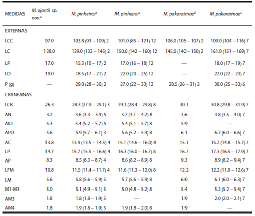 Marmosops pakaraimae y M. pinheiroi se diferencian de M. ojastii sp. nov., por su mayor tamaño en todas las dimensiones corporales externas, exceptuando la pata posterior, que es similar en las tres especies ( Tabla 1). Igualmente, las medidas craneales-dentales señaladas para M. pakaraimae y M. pinheiroi muestran diferencias en cuanto al promedio con respecto a M. ojastii sp. nov., siendo esta última menor en casi todas las dimensiones ( Tabla 1). M. pakaraimae y M. pinheiroi tienen un pelaje ventral con una clara predominancia de pelos de base gris mientras que M. ojastii sp. nov., posee pelaje ventral enteramente blanco a crema (amarillento) en toda la extensión desde la zona del mentón-garganta hasta la región de la cloaca, contrastando con los flancos. La diferencia en morfología del tubérculo carpal en los machos es igual a lo señalado para M. parvidens ( Figura 5b). M. pakaraimae y M. pinheiroi tienen la almohadilla tenar de la mano alargada, pequeña y no alineada con el tubérculo carpal en machos adultos. M. ojastii sp. nov., tiene la almohadilla tenar de la mano prominente, un poco más grande que el tubérculo carpal y alineada con éste en machos adultos ( Figura 5a). M. pakaraimae y M. pinheiroi poseen cúspides accesorias anteriores y posteriores en los caninos superiores ( Voss et al. 2013 ), la primera con tres cúspides sobre el talónido del m4 y la segunda a menudo con dos ( Voss et al. 2013 ). M. ojastii sp. nov., tiene sólo la cúspide posterior en C1 y el talónido del m4 es bicúspide.