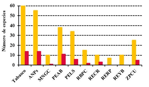 Riqueza y especies con criterio de protección en las áreas naturales protegidas. El Parque Estatal de Agua Blanca y el Parque Estatal La Sierra son las ANPs en donde se tiene la mayor riqueza de especies con 38 y 34 respectivamente, mientras que la Reserva Ecológica Río Playa es el área protegida con el menor número de especies registradas (7; Figura 2). Se encontraron un total de 14 especies de murciélagos con algún criterio de protección de acuerdo con la NOM-059-SEMARNAT-2010 ( Figura 2) 10 de las cuales se ubicaron en la categoría de Amenazada (A) y cuatro en la categoría de especie Sujeta a Protección Especial (Pr; Tabla 1). El Parque Estatal de Agua Blanca es el área con el mayor número de especies protegidas (11 especies; Figura 2). La reserva de la Biosfera Pantanos de Centla y el Monumento Natural Grutas de Coconá registraron el menor número de especies protegidas con dos y una especie respectivamente ( Figura 2). Del total de especies con algún criterio de protección tres solo se han registrado en el Parque Estatal Agua Blanca ( Chrotopterus auritus, Micronycteris schmidtorum y Pteronotus gymnotus) todas ellas con categoría de Amenazada (A) y solo una en el Monumento Natural Grutas de Coconá ( Peropteryx kappleri) en la categoría de Sujeta a Protección Especial.