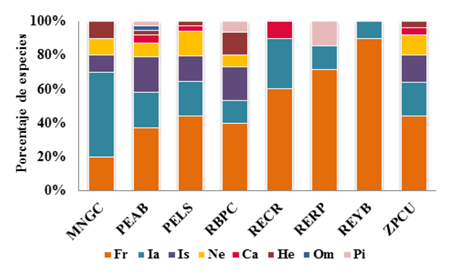 Gremios tróficos. De acuerdo a la forma de alimentación, los gremios insectívoro y frugívoro agrupan el mayor porcentaje de especies con un 49.1 % y 30.9 % respectivamente. Dentro de los insectívoros un 30.1 % son insectívoros aéreos y un 18.9 % son insectívoros de sustrato. Los nectarívoros representan un 9.0 % de las especies, seguido de los gremios hematófago y carnívoro por un 4.0 % y finalmente los omnívoros y piscívoros representados por un 2 % del total de las especies. En el Parque Estatal Agua Blanca se registraron los ocho gremios ( Figura 3), mientras que en la Reserva Ecológica de Yu-Balcah solo se registraron dos gremios ( Figura 3). En seis de las ocho ANPs evaluadas el gremio frugívoro registra la mayor cantidad de especies. Los gremios menos representados son el omnívoro presente únicamente en el Parque Estatal Agua Blanca y el piscívoro en tres ANPs ( Figura 3).
