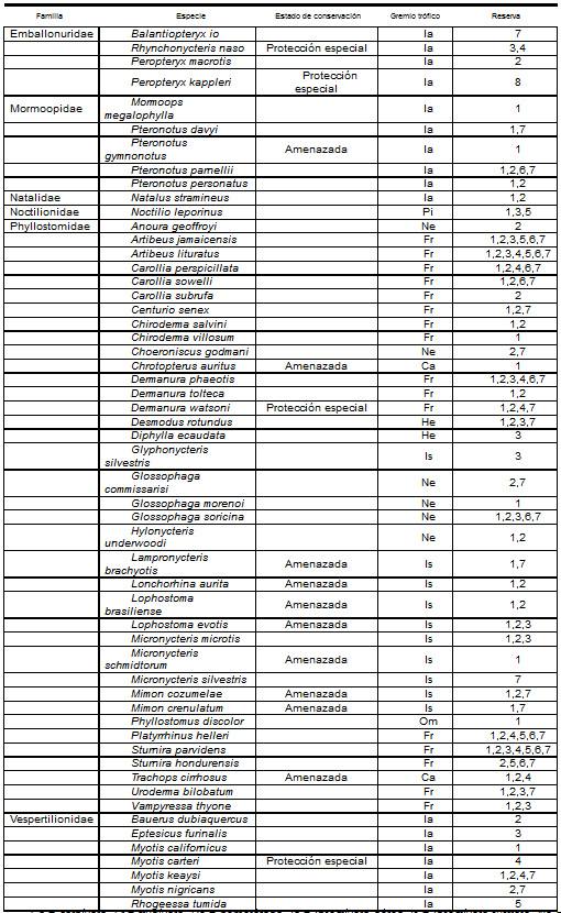 Los gremios tróficos fueron determinados a partir de la literatura ( Ceballos y Navarro 1991; Kalko y Hadley 2001; Giannini y Kalko 2004). Los datos sobre las categorías de riesgo en las que se encuentran las especies a nivel nacional están basados en la Norma Oficial Mexicana NOM-059-SEMARNAT-2010 ( SEMARNAT 2010). Las categorías de cada ANP fueron tomadas del SANPET (2002).