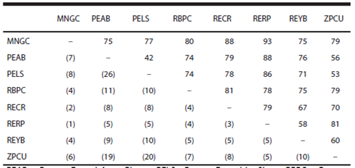 Complementariedad entre áreas naturales protegidas. La mayor complementariedad entre áreas naturales protegidas se registra entre el Monumento Natural Grutas Coconá y la Reserva Ecológica Río Playa con un 93.7 % de disimilitud. La menor completitud en composición de especies son el Parque Estatal de Agua Blanca y Parque Estatal la Sierra ( Tabla 2).