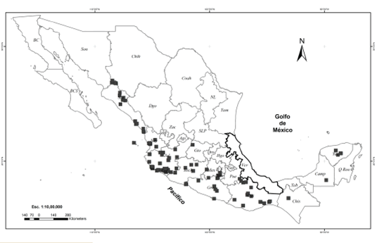 Las coordenadas geográficas de los sitios de registro, así como las obtenidas de la búsqueda documental fueron colocados en un espacio-mapa con la ayuda de un sistema de información geográfica (Arc Map 10.1(r)), para medir la distancia entre los registros históricos más cercanos al estado de Veracruz con los registros obtenidos durante las colectas para esta contribución.