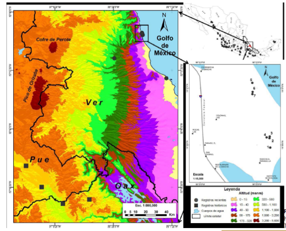 DISCUSSION AND CONCLUSIONS: These new records increase the species' known geographic distribution in 139 km, on a straight line from the nearest locality found in the state of Puebla. It is important to recall that these locations are all located on both sides of the Sierra Madre Oriental Mountain system (average altitude higher than 2000 meters above sea level, between localities), which serves as a barrier between the populations of Puebla and Veracruz.