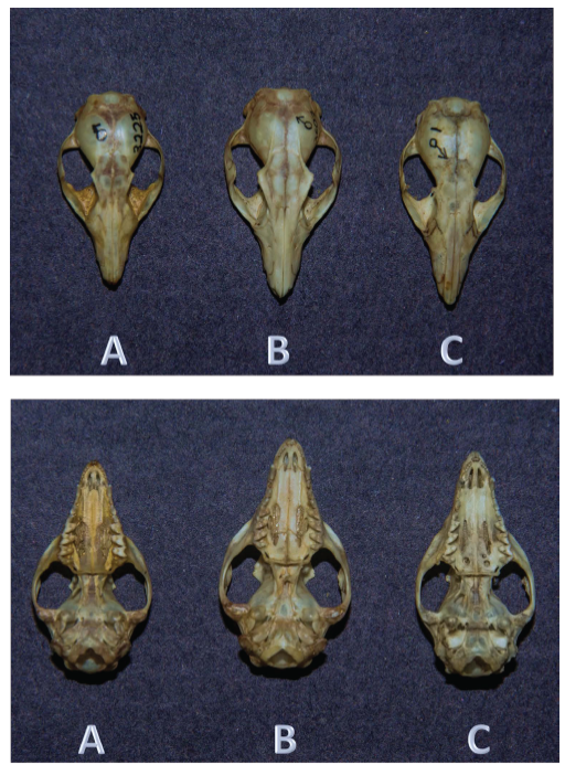 Fenotípicamente, Marmosa mexicana y Tlacuatzin canescens son muy parecidas, aunque se pueden distinguir entre sí por el pelaje, ya que T. canescens presenta un pelaje más corto y de color gris, bicolor, pelos con médula escalonada uniserial y escama ondulada irregular (Monroy y Rubio 2003; Baca y Sánchez 2004), mientras que en M. mexicana presenta un pelaje más largo y de color rojizo, bicolor, pelos con médula escalonada uniserial y las escamas tipo en forma de diamante ( Baca y Sánchez 2004). En T. canescens el antifaz formado por el anillo ocular es grande, de coloración negro y se proyecta sobre los frontales hacia la parte alta de la cabeza, en tanto que en M. mexicana no alcanza la parte superior de la cabeza. En el cráneo T. canescens desarrolla unos prominentes bordes supraorbitales en forma de ala, el paladar presenta fenestras palatales y a la altura del segundo molar superior presenta además otras fenestras palatales accesorias. En M. mexicana solo se desarrollan unos bordes supraorbitales de manera incipiente y únicamente presenta las fenestras palatales normales ( Figura 3). El proceso rostral del premaxilar de M. mexicana es más prominente que en T. canescens ( Villa y Cervantes 2002; Baca 2004, Ceballos 2005; Medellín 2005; Rossi et al. 2010).