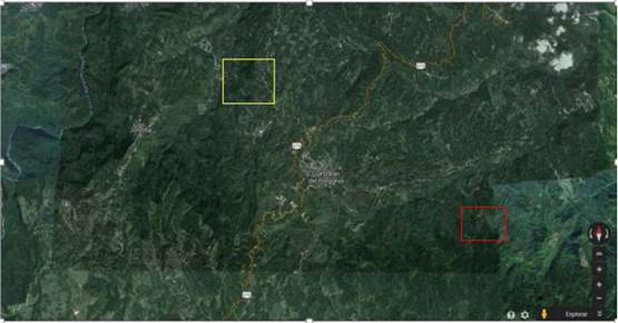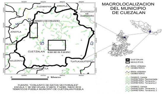 Zona de Estudio. El Municipio de Cuetzalán del Progreso se localiza en la Sierra Norte de Puebla entre los paralelos -19° 57' 00" y 20° 05' 18" N y los meridianos 97° 24' 36" y -97º 34' 5" W. Su altitud va desde los 320 hasta los 1,500 m ( Carrillo-Ruíz y Morón 2003). Presenta dos tipos de climas, semi-cálido húmedo con lluvias todo el año y cálido húmedo con lluvias todo el año con un rango de temperatura de 18 °C a 26 °C ( INEGI 2009). Presenta asociaciones de pino-encino, bosque tropical sub caducifolio, y bosque mesófilo de montaña ( Rzedowski, 1978); sin embargo, el municipio ha perdido la mayor parte de sus zonas boscosas (64 %; INEGI 2009; Figura 1). El trabajo de campo se llevó a cabo en dos zonas con diferente grado de perturbación: Rancho "El Paraíso" con una superficie de 50 ha de las cuales aproximadamente el 80 % se dedica a actividades ganaderas mientras que la reserva natural privada "Tecomateno" cuenta con 30 ha y está dedicada a la conservación del hábitat ( Figura 2).
