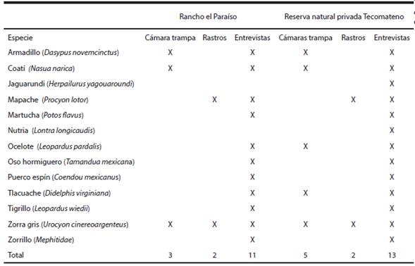 Se realizaron en total 12 salidas por sitio, acumulando un total de 163 noches trampa y 27 km recorridos (nueve transectos de 3 km) en el Rancho el Paraíso y 145 noches trampa y 22. 5 km recorridos (nueve transectos de 2.5 km) en la Reserva Tecomateno. En total se encontraron seis especies para la Reserva Tecomateno y cuatro para el Rancho el Paraíso. La zorra gris (Urocyon cinereoargenteus), es la especie mejor representada siendo la que presenta un éxito de captura mayor. Mediante las entrevistas, se documentó la presencia de 13 especies para la Reserva Tecomateno y de 11 en el Rancho El Paraíso estando ausentes la nutria (Lontra longicaudis) y el jaguarundi (Herpailurus yagouaroundi) que se consideran especies amenazadas ( Tabla 1).