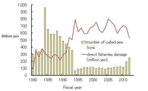 In addition, some marine mammals are considered as pest animals for fisheries (pest referring to a species that may include some animals that are a nuisance). Steller sea lions (Eumetopias jubatus jubatus) and harbor seals (P. vitulina stejnegeri) have damaged gillnet and set net fisheries in Hokkaido and Aomori Prefectures, northern Japan. The Hokkaido prefectural government has compiled lists of direct and indirect damage caused by Steller sea lions to fisheries since the 1989 fiscal year. Direct damage refers to the damage caused to fishing nets by attacking the fish already caught in the net, whereas indirect damage is the sum of losses of fishing opportunities and of yield due to depredation. Both direct and indirect damage on fisheries by Steller sea lions has increased since the 1990s. The direct damage to fisheries by Steller sea lions in Japan was calculated at ca. 270 and 490 million JPY in 1990 and 2012, respectively (as shown in Figure 1). The indirect damage was ca. 190 and 1000 million JPY in 1990 those same two years. The indirect damage caused by earlier closing of the fishing season is uncertain as additional catches of fisheries resources may reduce stock abundances in future. Although direct damage to fisheries by cetaceans is not known, an increase in cetacean populations may lead to a decrease in fisheries resources (Tamura et al. 1998). This is amongst the reasons why the Japanese Fisheries Agency has argued that it is necessary to restart commercial whaling, based on the premise of fisheries-cetaceans conflict. There is still scientific controversy concerning the interactions of cetaceans and fisheries resources (Yodzis 2001).