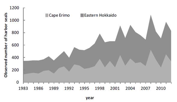 Wildlife management plan for harbor seals in Cape Erimo . The Harbor seal (Phoca vitulina) is a common species that is found in Hudson Bay, the Eastern Atlantic, the Western Atlantic, the Eastern Pacific and the Western Pacific, with a different subspecies in each of these regions. Western Pacific harbor seals (P. vitulina stejnegeri) are found in the Commander Islands, Aleutians, Kamchatka and throughout the Kuril Islands to Hokkaido in the western Pacific (IUCN 2014). The population of the whole subspecies is stable and is classified as Least Concern in the IUCN Redlist (IUCN 2014). However, the Erimo population that is found near Cape Erimo, Hokkaido, Japan, is genetically isolated (Nakagawa et al. 2010). This population, including pups (0 year olds) has decreased, and numbered only ca. 150 in the early 1980s, probably because of commercial harvesting of seals and of human activities including coastal fisheries (Kobayashi et al. 2014). There is another Japanese population of these seals, from Daikoku Island to Habomai Islands as identified by Mitchondrial DNA analysis (Nakagawa et al. 2010) and tagging studies, southeastern Hokkaido, Japan. Its average population growth rate has been approximately 5 %, per annum over the past 30 years, and recently bycatch has been the most important factor affecting this harbor seal population. Moreover, the number of haul-out sites has not increased in Japan, and approximately 50 % of these seals are found in the vicinity of Cape Erimo. The population size, however, has begun to increase since the 1980s (Figure 2). Even so, the harbor seal was listed as Endangered in 1992 on the Japanese Redlist.