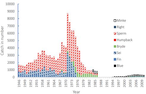 Because of overexploitation, hunting of the blue whale (Balaenoptera musculus), fin whale (B. physalus) and sei whale (B. borealis) was banned in 1964, 1975 and 1975, respectively. Hunting of the Bryde's whale (B. brydei) and north Pacific minke whale (B. acutorostrata acutorostrata) had started in 1964 and 1984, respectively. The abundances of minke whale has never been very low (Hakamada unpublished). Since 1986, commercial whaling of all large cetaceans has ceased to the moratorium enacted by the International Whaling Commission. Whaling of minke whales in north Pacific region under Special Scientific Permit in the North Pacific (JARPN) started in 1994. Similar whaling on sei, Bryde's and sperm whales in north Pacific region started in 2000.