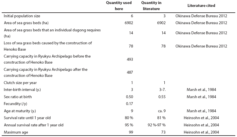 In addition, the following initial conditions were assumed (Table 1). The initial population size is six individuals despite the fact that only three individuals were found during the EIS. The carrying capacity depends on the area of sea grass beds in Ryukyu Islands, which was 6,902 ha (Okinawa Defense Bureau 2012). The carrying capacity before the construction of the Henoko Base was 493 individuals because each individual requires ca. 14 ha of sea grass beds for food, as assumed by the Okinawa Defense Bureau (2012). It is assumed that no individual died as a result of the construction of Henoko Base, because the patrol system will be installed so that construction operation stops when individuals approach into the construction site. The carrying capacity is taken to have decreased by 6 individuals (493 to 487) due to the sea grass beds in Oura Bay, the location of the Henoko Base, having decreased by 78 ha (Okinawa Defense Bureau 2012). Life history parameters that are used here are listed in Table 1.