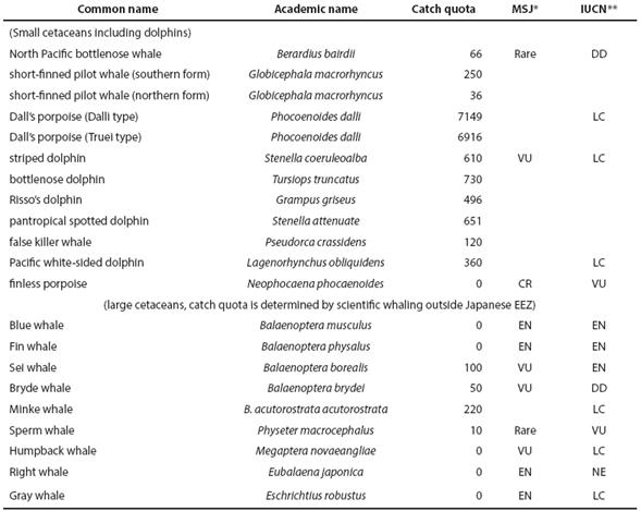 Japanese whalers also harvest small cetaceans and dolphins (Table 2). Short-finned pilot whale and Dall's porpoise appear as two different forms in Japanese waters. The annual catch limits for the small-type whaling operation are organized by Fisheries Agency of Japan in consultation with the scientific advices by experts of National Research Institute of Far Seas Fisheries. Japan Fisheries Research Agency compiles catch amounts and bycatches, assess the stock levels of small whales and dolphins in Japanese coastal regions, and determined catch limits for each species under the RMP. Japanese whalers catch large cetaceans including the minke whale both in Japanese waters and outside of Japanese Exclusive Economic Zone (EEZ) as shown in Figure 4.