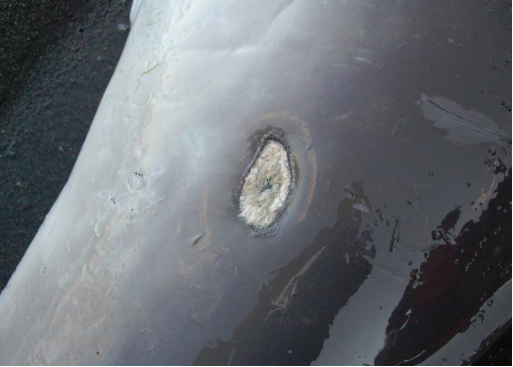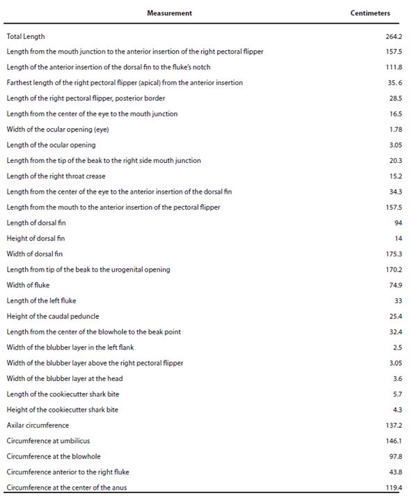 A weight of around 200 kg was estimated for the calf. The total length of the calf was 2.64 m (Table 1), according to Leatherwood et al. (1983) and Heyning and Mead (2009) corresponds to a newborn calf. Fetal folds were still somewhat perceptible (these are evident in newborns; Figure 1). Both body sides were carefully reviewed, there were no injuries that could link the death to a white shark (Carcharodon carcharias) attack; individuals of this shark species are numerous in this area of the island, there are about 200 known individuals (Hoyos-Padilla 2009). However, we noted the presence of a healing round wound on the left flank suggestive of a cookie cutter shark Isistius brasiliensis (Figure 2); a species that commonly attacks three species of pinnipeds and several species of cetaceans near the island (Gallo-Reynoso and Figueroa-Carranza 1992, 2005; Gallo-Reynoso et al. 2005a, and 2005b) and that have been reported to attack this species elsewhere (Jones 1971; Pérez-Zayas et al. 2002). The wound was more than a week old, suggesting that the calf should be older than a week. Therefore, we estimate that this calf was close to a month of being born. A detailed observation of the body surface did not show any cause of apparent death; there were no evident signs of trauma or infection (such as foul smell, ulcers or suppuration that might be present in the blowhole, mouth, throat, anus or the urogenital opening). The unusual finding that was noted, was the presence of a small bloody effusion together with some epithelial and muscle tissue masses that were extruding from the urogenital opening, showing probable signs of acute decompression.