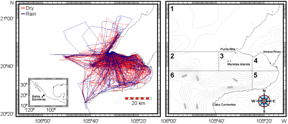 A coastal and an oceanic form of the bottlenose dolphin in the eastern North Pacific have been recognized but so far, genetic and morphometric variation has been associated with such organismal distinction only in California waters in relation with different feeding (Walker 1981; Curry and Smith 1997; Natoli et al. 2004; Perrin et al. 2011; Lowther-Thieleking et al. 2015). A slight coastal-offshore differentiation has been observed also for bottlenose dolphins in the Gulf of California on the basis of genetic, morphological and stable-isotope variation (Vidal Hernández 1993; Segura et al. 2006). Bottlenose dolphins from the Gulf of California appear more closely related with the California offshore form (Lowther-Thieleking et al. 2015) and coastal forms from both regions exhibit lower genetic diversity when compared with their respective offshore forms. All this suggests that coastal forms are local differentiations from one large open oceanic population (Perrin et al. 2011; Segura et al. 2006; Lowther-Thieleking et al. 2015). In the transitional region south of Baja California, morphotypes are not well defined and different forms often occur in sympatry, probably occupying different niches (Urbán Ramírez 1983; Vidal Hernández 1993). Such a situation occurs specifically at Bahía de Banderas which is a biologically-rich and conservation-prioritary region in the oceanographic transition between the East Tropical Pacific, the Gulf of California and the East North Pacific (CONABIO-CONANP-TNC-PRONATURA-FCF, UANL 2007). Research on bottlenose dolphins in Bahía de Banderas indicate the occurrence of a local population unit or herd (Ruiz Boijseauneau 1995; Rodríguez Vázquez et al. 2003), but data also exhibit traits of a large, open and socially-dynamical population (Mejía Olguín 2004). A preliminary analysis of mitochondrial (mt) DNA variation, indicates bottlenose dolphins from Bahía de Banderas as being part of a large open population and at the same time being differentiated with dolphins from other regions in the Gulf of California that show lower mtDNA diversity (Cerrillo-Espinosa and Flores-Ramírez 2012). In an analysis of dorsal fin morphometrics, bottlenose dolphins from Bahía de Banderas appear similar to dolphins from the Gulf of California where dolphins' dorsal fin exhibits high variation and local differentiation in contrast with dolphins from other regions in the Pacific coast of Baja California and the Gulf of México (Morteo Ortiz 2004).