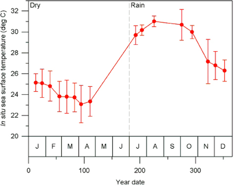 Sea work. Between January 2003 and April 2005, we surveyed an area of ca. 2,500 km2 in Bahía de Banderas and surrounding waters in the Mexican Pacific Ocean using outboard boats during light hours. This area was calculated from a transect-set of 20,641 km in total (Figure 1). The visited area was partitioned in six zones with different topographies and interactions with the neighboring lands defined mostly by the outflow of several rivers in the inner part of the bay and the environmental particularities around Marietas Islands (Figure 1). Seasons were classified as dry (January-June) and rainy (July-December) on the basis of climate data (e.g. Salinas Zacarías and Bourillón Moreno 1988) as well as on our own records of sea surface temperature (Figure 2). Bottlenose dolphins were observed as much as possible until a coloration class (light gray, dark gray or brownish) and a length-class (large or small) were identified. The comparison of the body size classes with the observing boat, allowed estimate that class partition is in the range of length 2.5 - 3.0 m. We also registered the occurrence of a light coloration in the peduncle dorsum that defines a trait that we call "Socorro" and that we have observed in bottlenose dolphins from Revillagigedo Islands and Baja California (Figure 3). Size and color classes were recorded only when they were confidently determined after different light orientations of well-shown animals, near observation and consensus between at least three different observers to minimize subjectivity in data registration. Two sightings exhibited mixed light- and dark-colored animals. For these cases, we registered the light coloration that was the most abundant in these cases. Color and size were assigned for the entire pods only if well-grown animals were observed as judged from body-build, observable behavior (e. g. fights), scaring and presence of calves. From the 170 bottlenose dolphin sightings archieved, we were able to identify size and color classes only for entire 75 sightings as well as for 1,133 individuals out of 1,932 individuals in total.