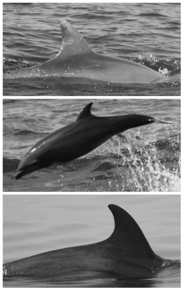 Photographic marking. We identified individual dolphins by getting film-photographs (ASA 400) of their dorsal fins that were later digitalized to TIF format. Only photographs with resolution, focus, illumination and orientation appropriate to easily distinguish individuals were examined. We made a total of 302 identifications of 207 individuals with assigned classes of color and size determined during observation as described above. Color and size classes were independently assigned to each identification, this is, without knowledge of previous morphological assignments for recaptured animals. This procedure allowed evaluation of error in morphotype assignment when attained. We compared our photo-identification catalogue with the one developed by Ruiz Boijseauneau (1995). We used our mark-recapture data here to examine the morphotypes' dispersion as related with the distribution of animals. We left apart an extensive analysis of absolute abundance (Viloria Gómora 2007).
