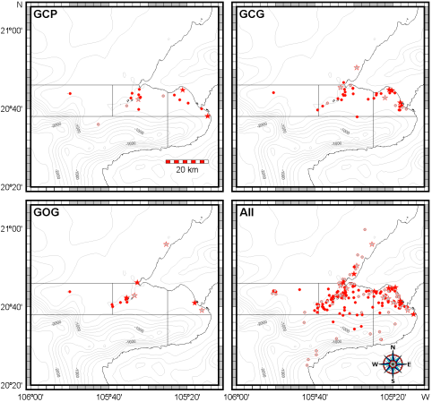 Even though the GCG form is distinctive and is also the more abundant morphotype in the Bahía de Banderas region, it is in all morphological and ecological traits intermediate between the GOG and the GCP forms. In a related study of the dorsal fin morphology using 20 quantitative and four qualitative characters for the three bottlenose dolphin putative morphotypes, the rough-toothed dolphin and the pygmy sperm whale, Juárez Rodríguez (2008), found statistically-significant differences between species as well as overlapped and equidistant differences between the three bottlenose dolphin putative morphotypes being the difference between GCG and GOG the only comparison statistically significant. Hence, morphological and ecological variation of bottlenose dolphins in the region may be interpreted as the overlapped occurrence of one open pelagic form (GOG) that calves in the coast, one local and coastal form (GCP) and an abundant intermediate form (GCG). Therefore, bottlenose dolphins in the Bahía de Banderas region could be viewed as a particular case of the general pelagic-coastal differentiation of the species in which there is population continuity with ordered variation around the reduced and near-land boundaries between the pelagic and coastal environments of this region. A metapopulation of one large oceanic population with local coastal demes and with extended intermediates around the pelagic-neritic frontier appears as a first model for bottlenose dolphins in the transitional region of the Mexican Pacific Ocean. Such a model could help to explain the preliminary mtDNA data by Cerrillo-Espinosa and Flores-Ramírez (2012) indicating that bottlenose dolphins from Bahía de Banderas are part of a large open population and that at the same time, they are differentiated with dolphins from other regions in the Gulf of California that show lower mtDNA diversity. Our metapopulation model can thus be interpreted in terms of the Wright's shifting balance theory (1932) in which local adaptations and genetic differentiation occur in the coasts simultaneously with population expansions and gene flow from the boundaries between the coasts and the open ocean. Such a pattern of population fragmentation in the coasts occurring simultaneously with panmixia in the pelagic realm has been described in a large and detailed geographical scale for the spotted dolphin in the eastern tropical Pacific Ocean by examination of mitochondrial and microsatellite DNA variation (Escorza-Treviño et al. 2005). These concurrent processes of coastal isolation and oceanic gene flow also appear associated in general with postglacial population expansions in tropical cetaceans (Medrano González 2006).