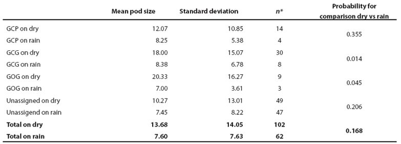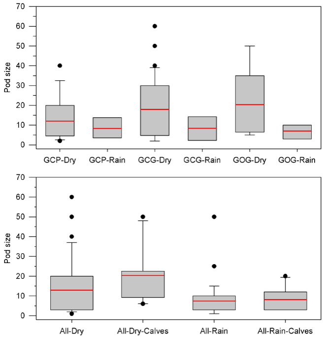 Pod size and calving patterns: For all bottlenose dolphins and for the three putative morphotypes, pod size was larger in the dry season and was larger too when calves were present. General mean pod size in the dry season was 13.0 ± 14.1 with no calves and 20.3 ± 12.8 with calves (P = 0.114). For the rain season, mean pod size was 7.8 ± 8.0 with no calves and 8.2 ± 6.0 with calves (P = 0.742). Pod size was statistically different between the dry and the rain season for both, groups with and without calves (P < 0.017; Table 4; Figure 5). In the dry season the GOG form shows the largest mean pod size (20.3 ± 13.6) followed by the GCG form (18.0 ± 15.1) and the GCP form (12.1 ± 10.9). In the rain season, mean pod size is smaller, less variable and similar among morphotypes with 7.1 ± 3.6 for GOG, 8.4 ± 6.8 for GCG and 8.3 ± 5.4 for GCP. Statistical significance of seasonal variation for pod change was observed for the putative forms GCG and GOG. No statistical significance was observed for pod size variation among morphotypes within seasons (Table 4; Figure 5).