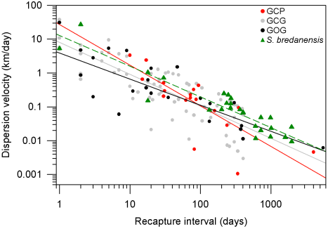 Where Vt is the dispersion velocity at time interval t, V1 is the distance travelled by dolphins in one day and k < 0 is the decaying rate of dispersion velocity in time. Mind that dispersal events beyond the surveyed area cannot be detected. To hint how different the dispersion patterns of bottlenose dolphin morphotypes are, these were compared with the dispersion pattern of a different species, the rough-toothed dolphin (Steno bredanensis), that was obtained with the same search effort and previous data from our research group compiled by Pompa Mansilla (2007).