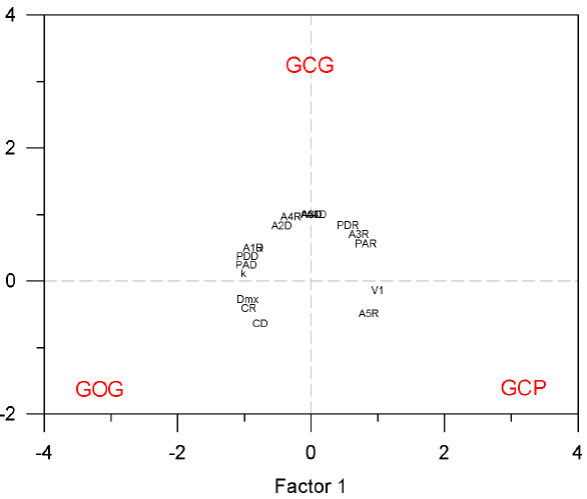 Ecological classification of morphotypes. We determined the relationship between the three putative morphotypes of bottlenose dolphins in terms of population ecology performing a classification analysis of principal components based on nine characters of spatial and seasonal abundance, four characters on the seasonal variation of pod size, two characters on the seasonal occurrence of calves and three characters on the dispersion parameters obtained from mark-recapture data. Since we examined variation among the three main morphotypes of bottlenose dolphins, the two first components accounted for the total variation. The first principal component contained 56.3 % of the whole variation. The three morphotypes appeared equidistant around the center of the principal components plane indicating that they are equally distinctive. The 18 traits appeared in a circle around the center indicating that they are equally informative to define morphotypes (Figure 7). This analysis also shows associations between morphotypes and traits. Traits V1 and A5R distinguish the GCP form with minimum distance between traits and morphotype on the principal components plot of 2.61 in average and canonical correlation of 0.93; traits Dmx, CR and CD distinguish the GOG form with minimum distance between traits and morphotype on the principal components plot of 2.59 in average and mean canonical correlation of 0.96; traits A2D, A3D, A4D, A4R and A5D distinguish the GCG form with minimum distance between traits and morphotype on the principal components plot of 2.27 in average and mean canonical correlation of 0.96; traits PDR, PAR and A3R are associated with GCP and GCG, and traits A1R, A1D, PDD, PAD and k are associated with GCG and GOG (Figure 7). No traits were associated with the combination of GCP and GOG and this also is reflected in the fact that the Euclidean distance between GCP and GCG is the same than the distance between GCG and GOG (1.37) whereas the distance between GCP and GOG is slightly larger (1.50). This means that the GCG form is ecologically intermediate between GCP and GOG. When the normalized values of the 18 ecological traits were compared among the three putative morphotypes using the paired Student's t-test, only the comparison between GCP and GCG was statistically significant with type I error of P = 0.004.