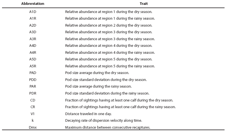 Ecological classification of morphotypes: For the three putative morphotypes of bottlenose dolphins, we compiled their relative abundance in each zone and season (9 characters as bottlenose dolphins were not observed in all zone and season combinations), the seasonal average of pod size and its standard deviation (4 characters), the seasonal occurrence of calves (2 characters) as well as the parameters for dispersion (3 characters). The population ecological traits analyzed are differentially influenced by the environment and change in different time scales. However, the statistical distributions of these traits are theoretically expected to be the same or similar for a population entity (deme) during an observation period with given conditions. For example, pod size may change in a few minutes but its statistical distribution is expected to be repeated after several observations if the determinants for the animals grouping have not changed. Such changes in animals grouping anyway are alternative hypotheses that leave trait variation as indication of population identity. The population ecological traits used to describe heuristic morphotypes were abbreviated as follows: Abundances were indicated with character A followed by the zone number and a season character (D for the dry season or R for the rain season); pod size was indicated with character P followed by an A for the average and a D for the standard deviation and finally by the season character; calving was indicated with character C followed by the season character. Dispersion parameters were indicated as Dmx for the maximum distance between consecutive recaptures, V1 for the distance traveled in one day and k for the decaying rate of dispersion velocity along time. Notice that the ecological traits employed are assignable to the data grouped by putative morphotype and not to the individual data within groups. This restrains the contrast of variation within and between morphotypes. The total 18 ecological traits (Table 1) were normalized by the variation among the three main morphotypes as follows: