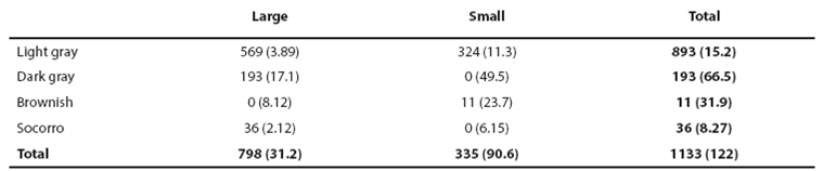 Heuristic identification of morphotypes. From the 170 sightings of bottlenose dolphins achieved, only in 75 size and color classes were identified for the entire pod to yield an assignment efficiency of (75/170) = 0.44 for sightings. Efficiency of form assignment for observed individuals was (1,133/1,932) = 0.59. We identified the putative forms small light-gray (GCP, 18 sightings), large light-gray (GCG, 38 sightings), large dark (GOG, 12 sightings), small brownish (CaP, 3 sightings) and large Socorro (SoG, 4 sightings). For the combination of size and color classes among 1,133 observed individuals (Table 2), the χ2 correlation was not significant for GCG given the occurrence of the also large GCP and GOG forms but the high amount of GCG individuals and sightings indicates that they must be considered a form (Table 2). The small brownish form was identified only in 11 individuals and one individual identified first as CaP was assigned to the GCP form in a recapture. Therefore, the CaP form may be part of the GCP form or a marginal form in the region. The Socorro form may be related with the dark form given their association with large size or it may be also marginal in the region given its low occurrence (Table 2). Resolving if true morphotypes are defined by size or color classes only, must thus come from finding high ecological similarity among the three main apparent forms GCP, GCG and GOG. With exception of the individual identified as CaP in its first capture and recaptured as GCP described above, all individuals with independent assignment of size and color in mark and recapture events (46) exhibited concordant morphotype identifications. This yields a global error in form assignment of (1/(46+1)) = 0.02 when the assignment was achieved.