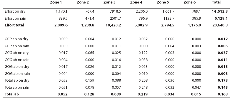 Spatial and seasonal distribution. The general distribution of bottlenose dolphins that we found in Bahía de Banderas is almost the same described by Ruiz Boijseauneau (1995) and Mejía Olguín (2004). Relative abundance is higher in the northern shallow zone within the bay (zone 4) near the Ameca River followed by zones two and three in the shallow area out of the bay and in the bay's northern opening respectively (Table 3; Figure 4). Calves occurred close to the shore, especially in the inner northern zone four. General abundance is lower in the rain season and the distribution during this time of the year also expands towards open waters in the North and deeper waters in the South. This seasonal pattern is similar for bottlenose dolphins in general as well as for the individual morphotypes (Table 3; Figure 4). The GCG form exhibits the largest abundance among morphotypes (0.03 individuals/km) and it is more abundant in the external shallow zones two, three and one as well as in the internal zone four. The GCP form instead (0.01 individuals/km), is more abundant in the internal zone four, the external zones three and two and the internal and deep zone five. The GOG form (0.01 individuals/km) appears to have a disrupted distribution in the internal zone four and in the external zones two and one (Table 3; Figure 4).