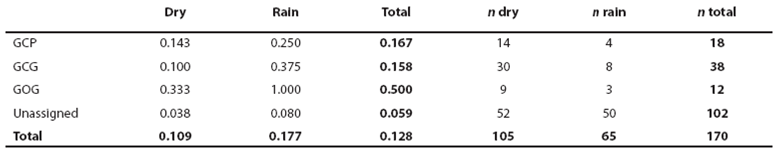 Calving, defined as the fraction of sightings having at least one calf, is larger in the rain season for all bottlenose dolphins and for the morphotypes. The ratio between calving in the rain season and calving in the dry season was 1.63 for all dolphins, 1.75 for the GCP form, 3.75 for the GCG form and 3.00 for the GOG form (Table 5). Seasonality in calving is thus apparently more marked for GCG and GOG forms. GOG was also the form with higher calving values. No statistical significance was detected for calving rate variation among morphotypes or seasons. Pod size and calving patterns among morphotypes must be considered with caution as these data for the identified forms were scarce (Table 5).