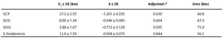 Dispersion patterns. Comparison of our photographic catalog with the catalog by Ruiz Boijseauneau (1995) yielded two matches, one for a GOG individual with 5,502 days between captures and another for a GCP individual with 4,015 days between captures. For the GCG form and the rough-toothed dolphin, the longest recapture intervals in our data were 406 days and 1968 days respectively. The largest dispersion distance observed between consecutive recaptures (Dmx) in our data were 41 km for GCP, 47 km for GCG, 71 km for GOG and 56 km for the rough-toothed dolphin (Table 6). Dispersion of the bottlenose and rough-toothed dolphins appears as a negative power law for the velocity of dispersion along time since dispersion distance is bounded at least to the surveyed area. According to this model for dispersal (Table 6; Figure 6), the GCP form shows a higher travel distance in one day, a smaller maximum distance between captures and a higher rate of decaying dispersion-velocity along time. The latter implies that the GCP form could disperse over smaller areas faster than other putative bottlenose dolphin morphotypes and dolphin species. On the other hand, the dispersion parameters for the GOG form indicate that these dolphins disperse more slowly over larger areas as compared with the other dolphins. The dispersion parameters of the GCG form appear intermediate between GCP and GOG. The rough-toothed dolphin exhibits a dispersal pattern in which these animals seemingly travel long distances in short times covering a large area. However, our data suggest that rough-toothed dolphins do not disperse as fast as the bottlenose GCP putative form and neither cover an area as large as the bottlenose GOG putative form (Table 6; Figure 6). Standard errors of the regression parameter V1 (distance travelled by dolphins in one day) do not overlap among putative morphotypes or the two dolphin species. For parameter k (the decaying rate of dispersion velocity in time), standard errors exhibit a degree of overlapping among the rank-adjacent morphotypes or species (Table 6).